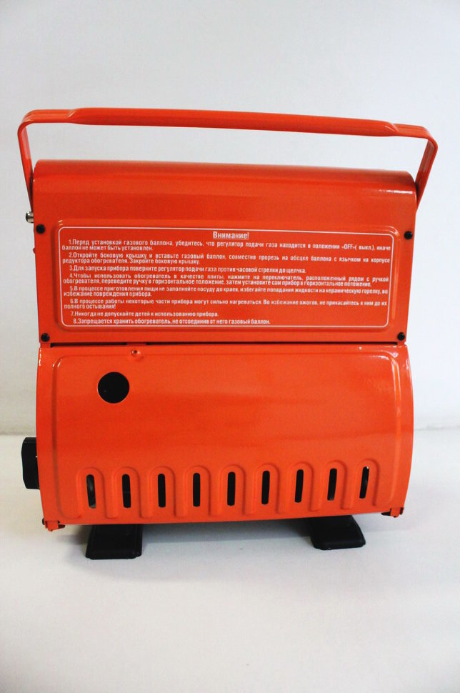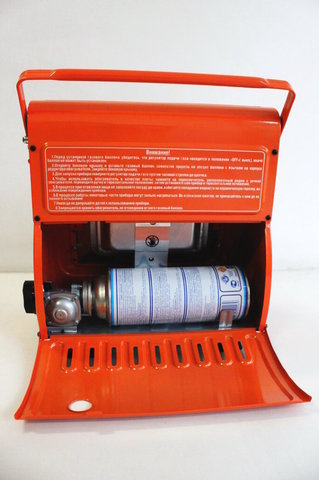 Основным преимуществом данного обогревателя является высокая мощность работы (площадь отапливаемого помещения до 15 кв.м.) и возможность использования его для приготовления пищи. Для питания прибора используется сжиженное газовое топливо в баллонах с клапаном нажимного типа и цанговым захватом 220 гp.