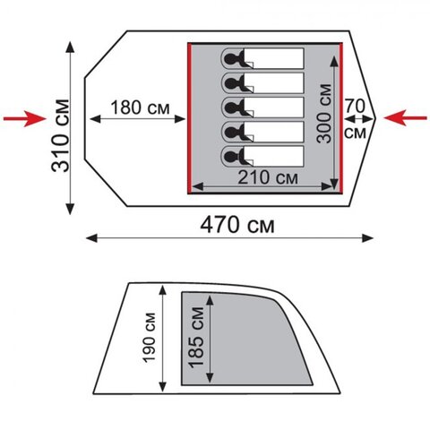 | Все размеры | внешняя палатка 470(Д)x310(Ш)x190(В) см, внутренняя палатка 210(Д)x300(Ш)x185(В) см |
